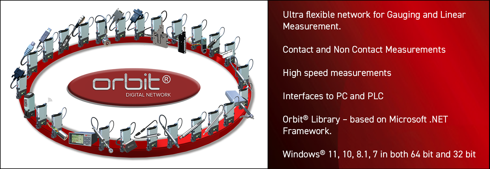 A Solartron Metrology fornece um sistema modular líder da categoria em sua Orbit® Digital Network. Com suas sondas calibradas, vários gateways e a capacidade de conectar sensores de terceiros, o Orbit oferece um rendimento mais rápido, menor custo e melhor coleta de dados do que qualquer sistema analógico ou convencional.