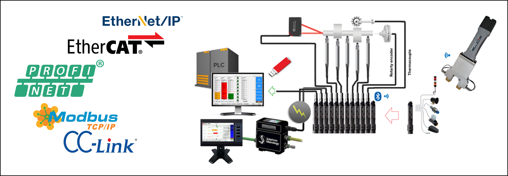 A Solartron oferece várias conexões de interface para sensores de terceiros, incluindo saída analógica DC e 4.20mA, Digimatic, TTL e outros. Há também um módulo que se conecta a medidores de ar. Nenhuma outra rede oferece tanta versatilidade.